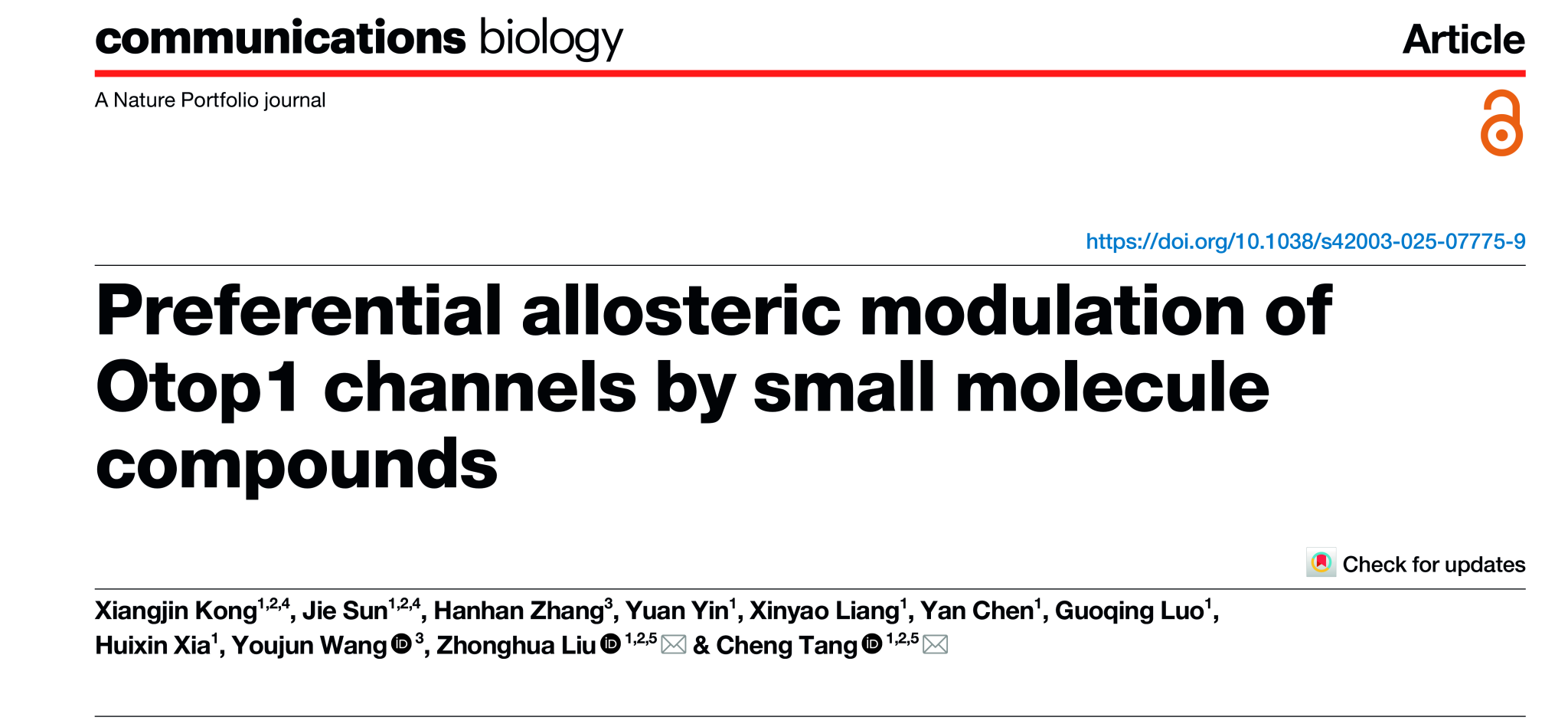 近日,我院动物多肽药物创制国家地方联合工程实验室唐城副教授课题组在Nature旗下著名期刊Communications Biology(中科院1区TOP)发表了题为 “Preferential allosteric modulation of Otop1 channels by small molecule compounds”的研究论文,在酸味觉受体离子通道OTOP1的门控和药理学研究方向取得重要进展。