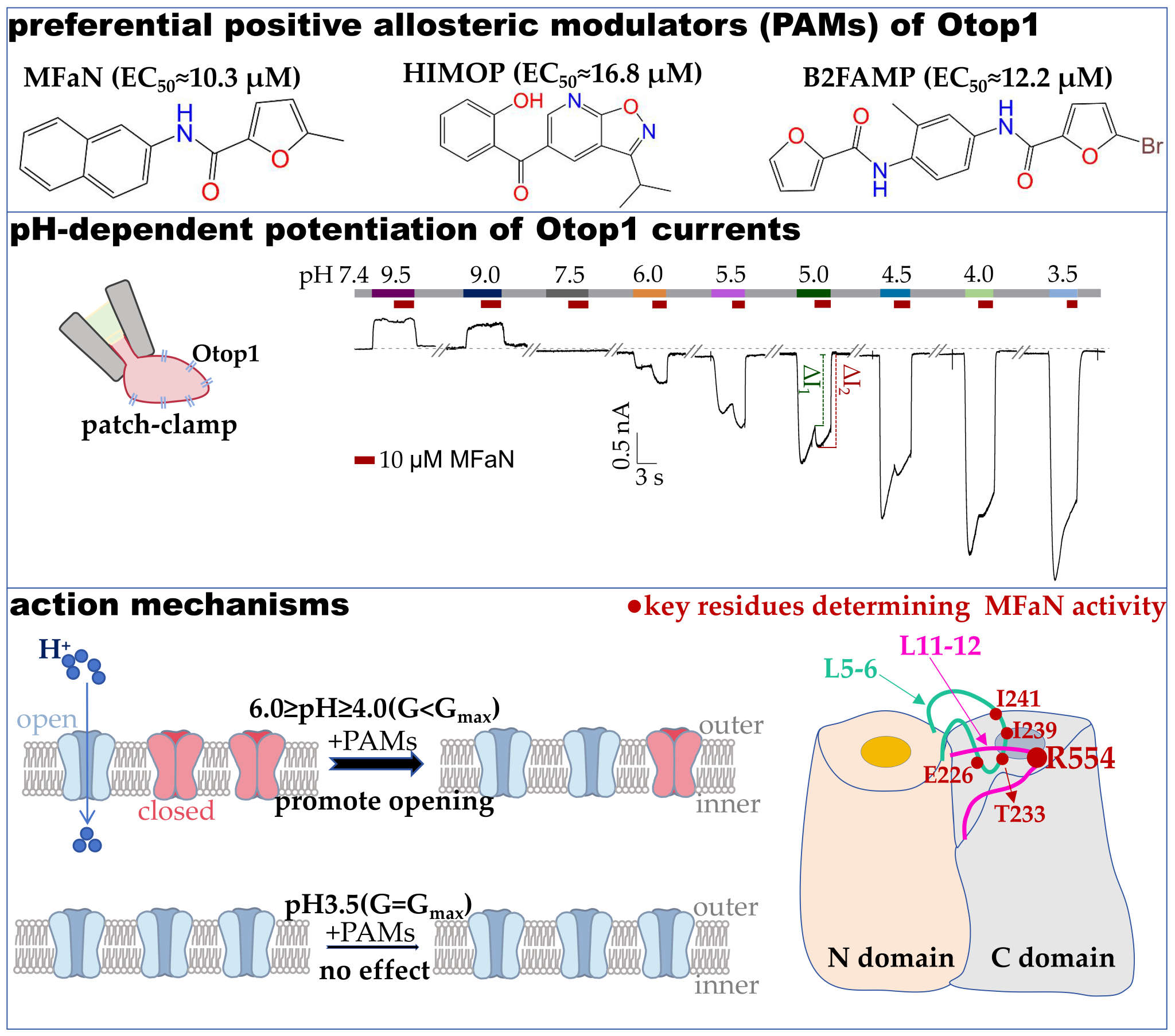 Otopetrin1(OTOP1)最初被鉴定为调控脊椎动物耳石发育的关键蛋白,其基因突变导致前庭平衡功能障碍。2018年,美国南加州大学Emily Liman教授团队在《Science》发表的突破性研究揭示该蛋白是一种全新的质子通道。近年来研究发现,OTOP1是介导哺乳动物酸、碱、铵味觉感知的受体,同时其于肥胖病理条件下在棕色脂肪组织中的高表达有助于减少脂肪组织炎症并维持代谢稳态,具有重要的生理病理功能。自OTOP1的离子通道功能被发现以来,针对其生理功能和电镜结构解析的研究取得了重大进展,但对于OTOP1通道门控机制和药理学特性的研究相较于其他类型离子通道仍然非常滞后。同时,已报道的OTOP1通道调制剂存在活性低、选择性差等弊端,严重制约了它们作为分子和药理学探针研究OTOP1通道的应用。新型高亲和力和专一性调节剂的开发,成为突破这一研究瓶颈的关键。