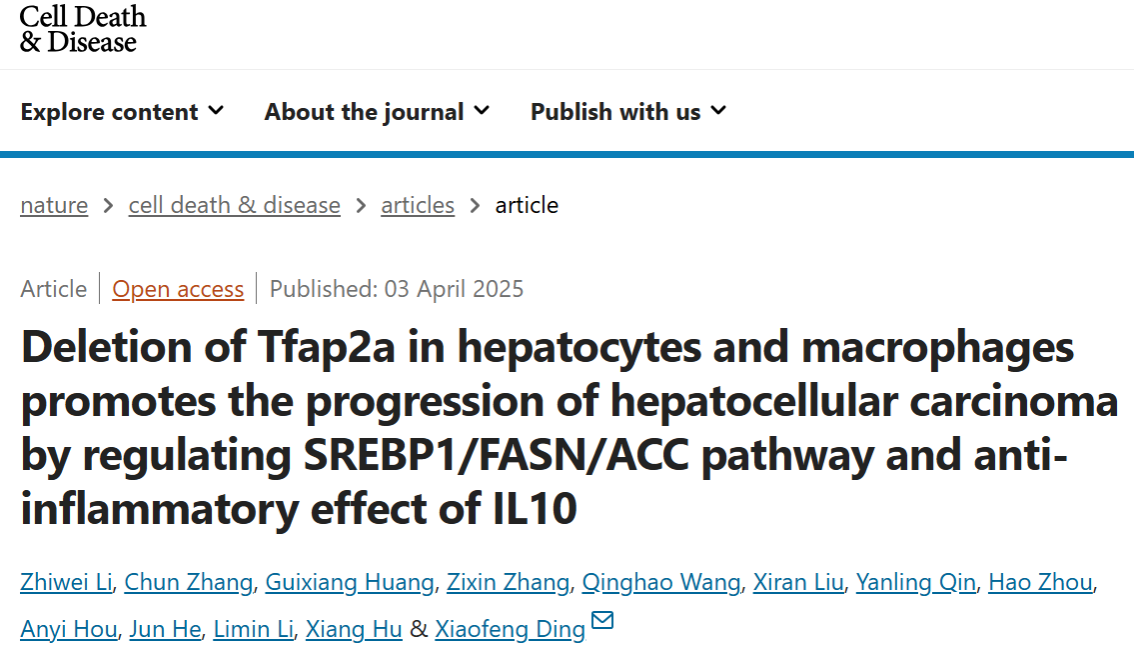 近日,sunbet申搏sunbet申搏动物多肽药物创制国家地方联合工程实验室丁小凤教授团队以“Deletion of Tfap2a in hepatocytes and macrophages promotes the progression of hepatocellular carcinoma by regulating SREBP1/FASN/ACC pathway and anti-inflammatory effect of IL10”为题,在中科院1区刊物《Cell Death & Disease》(IF: 9.6)上发表最新研究成果,首次系统揭示转录因子AP-2α在肝细胞和巨噬细胞中调控脂质从头合成及炎症反应,在原发性肝细胞癌(HCC)中的关键作用与机制。