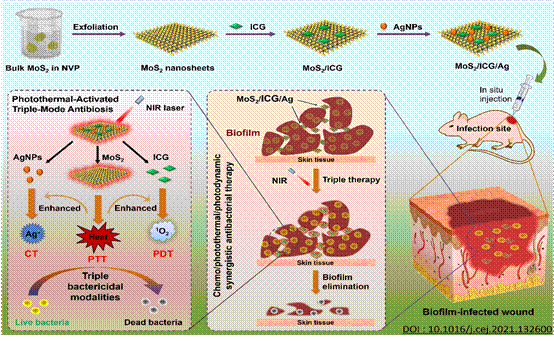 MoS2/ICG/Ag纳米复合材料的制备及协同抗菌示意图