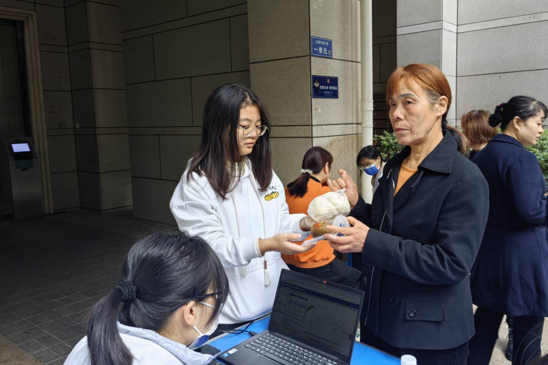 志愿者们协助医护人员给老人登记信息