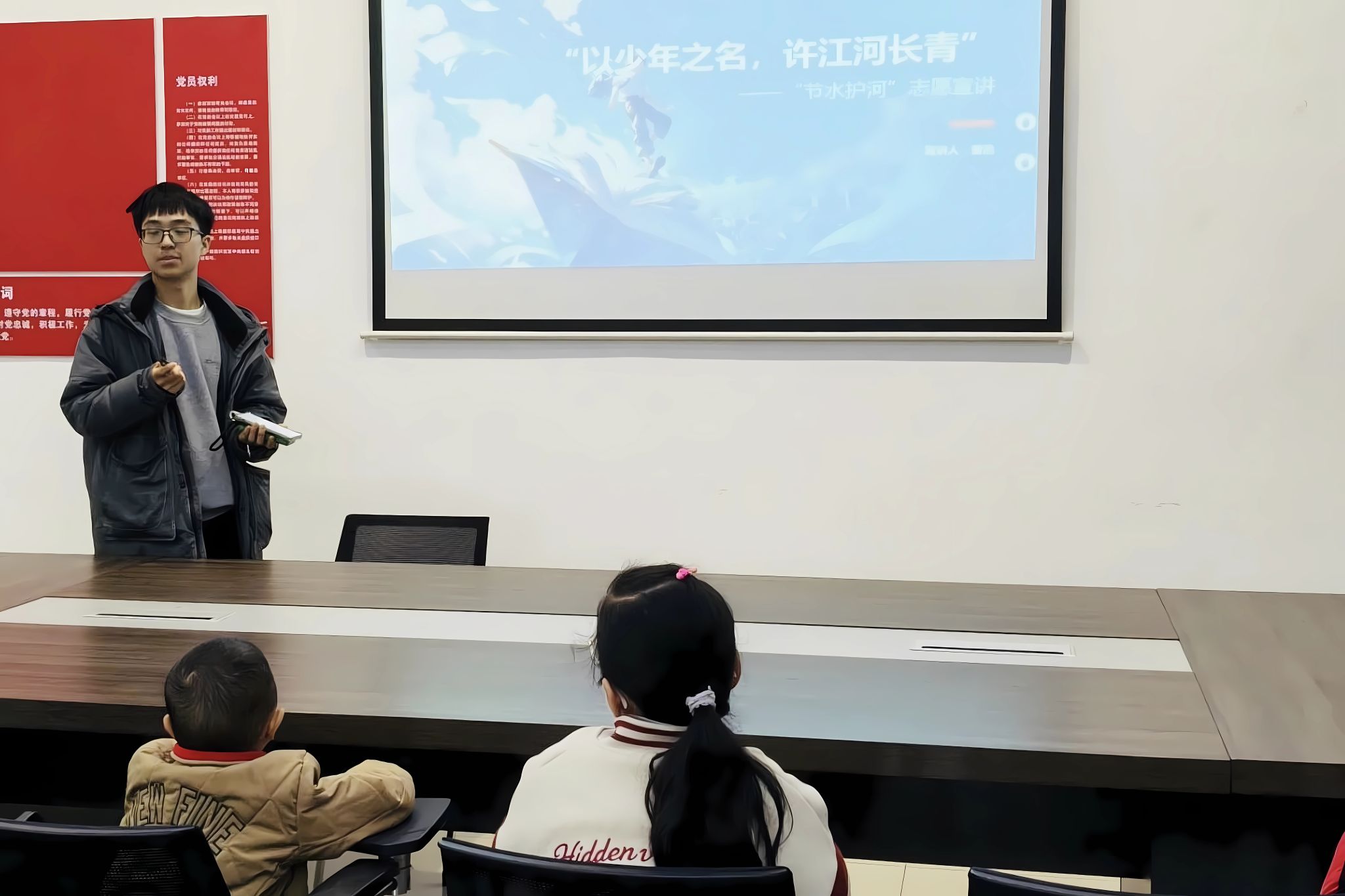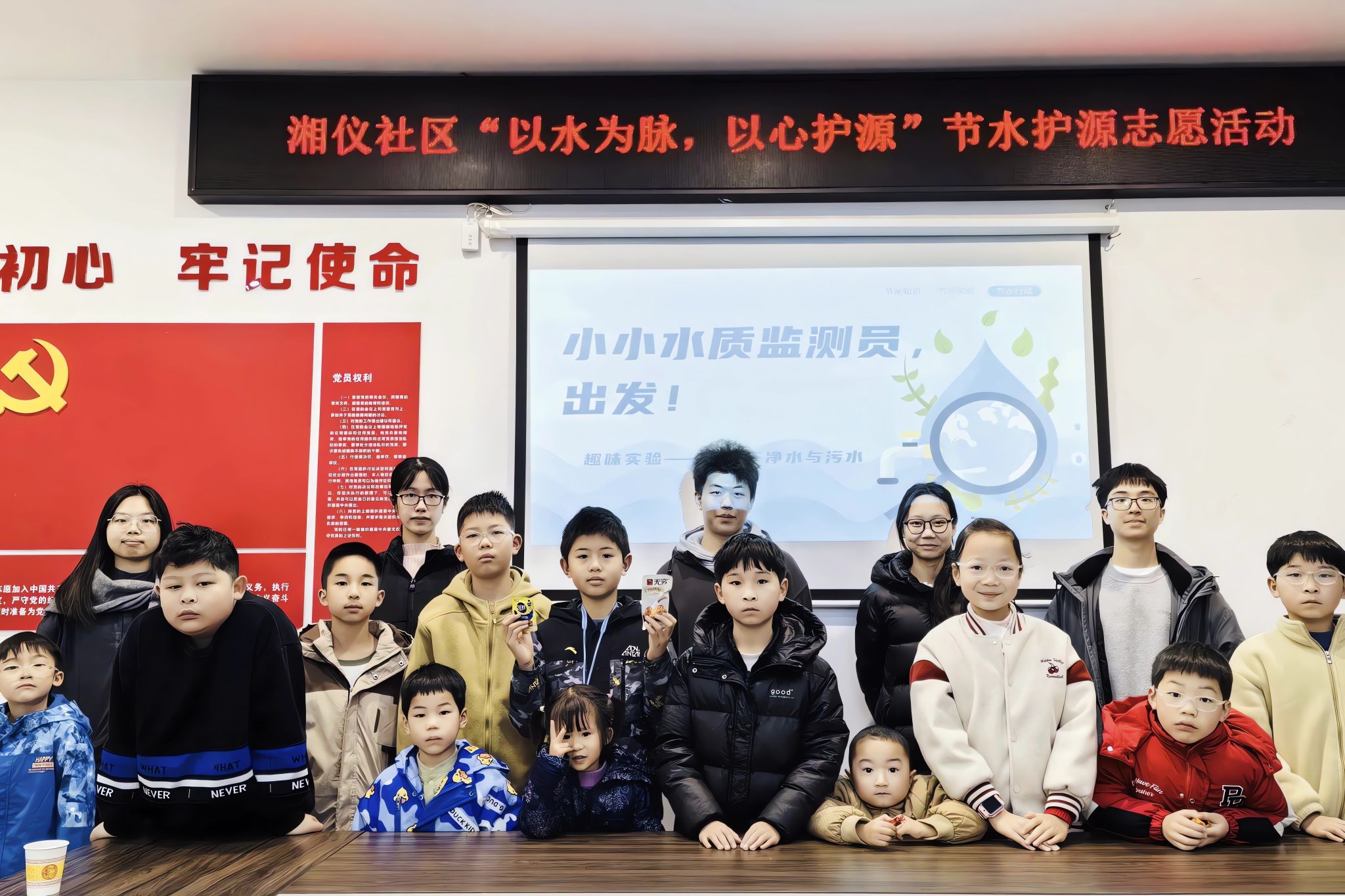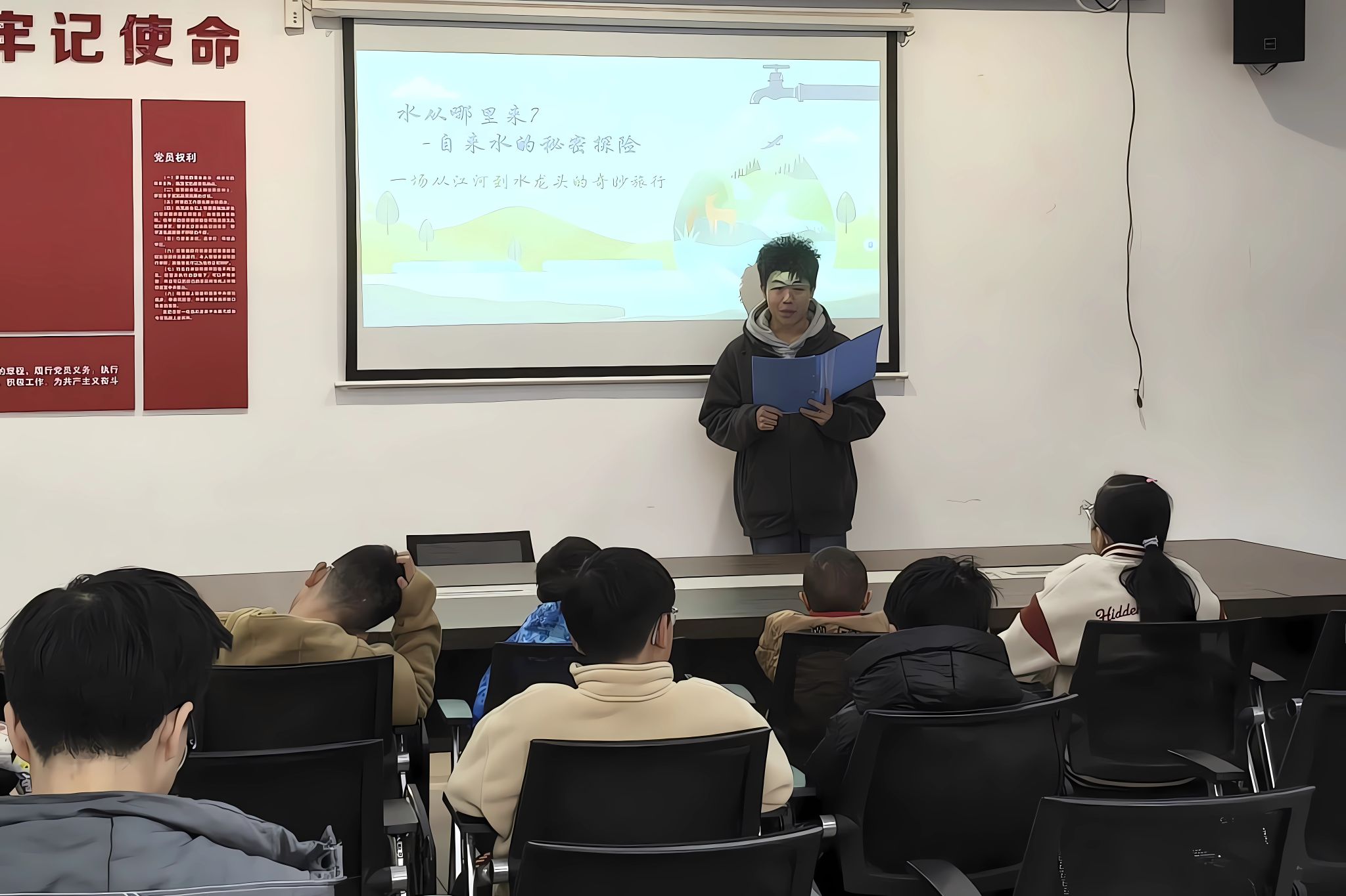 在面向低年级学生群体的科普宣讲活动中,志愿者们围绕“节水护源”主题,展开精心设计的宣讲与实践环节。在趣味宣讲部分,志愿者们通过生动的动画PPT,系统地拆解“自来水的由来”,详细展示从取水到最终入户的完整流程,使抽象的制水工艺变得直观易懂,有效强化孩子们的认知。随后,宣讲转向“护水行动”,志愿者分享日常实用的节水技巧,引导孩子们理解节水的意义并将其付诸行动。实践环节中,志愿者引导孩子们亲手操作,使用pH试纸对比观察“干净水”与“模拟污水”样本,让他们辨别颜色、浑浊度的差异,并观察试纸颜色变化以初步感知酸碱度的不同,从而直观感受水污染特征,掌握基础的水质辨别技巧。整个过程中,孩子们认真聆听、积极互动并踊跃动手实践,现场学习氛围热烈。