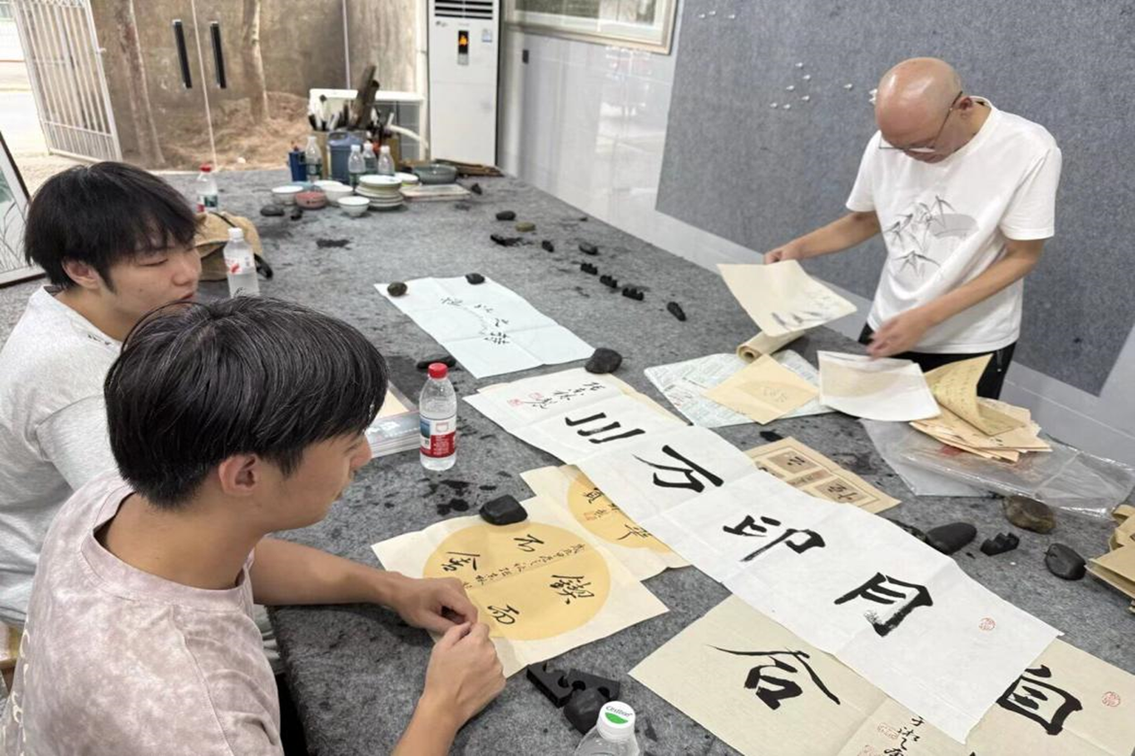 实践团成员走进张东林老师的工作室开展交流活动,期间获赠张东林老师的书法作品,深入了解版画、国画创作技法与文化内涵。张东林向实践团成员介绍,工作室中陈列的两幅版画作品的创作源于他后期对山水风格版画的创作偏好。实践团成员通过近距离观察,了解到这类版画的创作特点。除版画外,实践团成员对张东林的国画作品进行欣赏,其中以虾为主题的创作尤为突出。在作品展示过程中,张东林讲解了“淡墨勾虾身,浓墨点虾眼”的创作技法,实践团成员观察到虾的质感与动态在笔锋转折间的呈现效果。交流中,成员围绕绘画创作的具体步骤与技法要点与张东林展开探讨,进一步明晰版画与国画在创作理念、表现形式上的差异与联系。