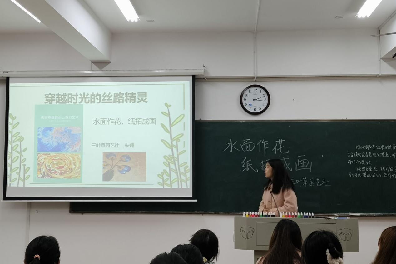 (通讯员 伍鼎载 谭莎莎)11月19日下午,sunbet申搏三叶草园艺社于生科院B108教室举办“水面作花,纸拓成画”手工活动。生科院三叶草园艺社理事朱婕担任此次活动主讲人。