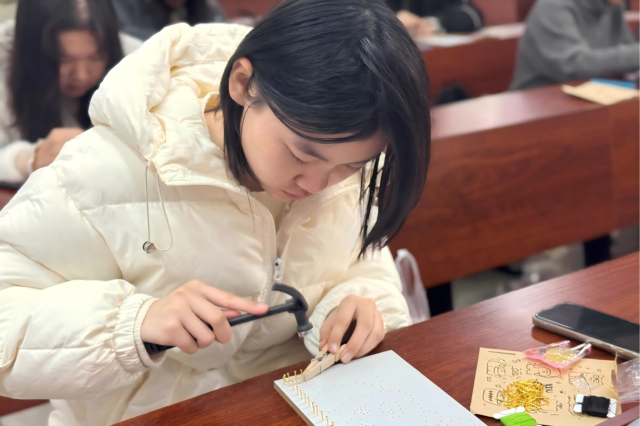 主讲人结合优秀绕线作品进行讲解,重点介绍绕线画的设计转印、钉孔定位、绕线手法及收尾处理全流程,并提醒要安全规范使用工具。通过主讲人的讲解,同学们了解到钉子定位和绕线逻辑是决定绕线画画面工整度的关键步骤。在社团工作人员全程协助下,同学们领取木板、丝线、钉锤等材料,针对绕线松紧、图案把握等实际问题进行探讨,发挥创意,完成绕线画作品。所有作品均被拍照留念,并进行装裱养护。