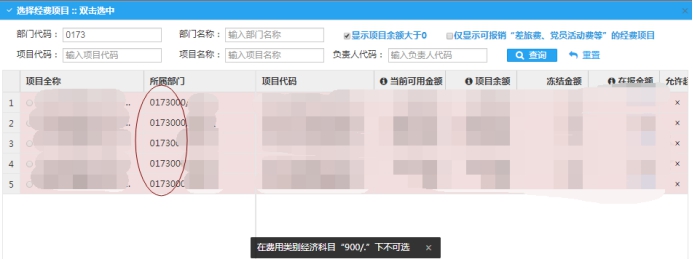 27.填写申请单选择报销类型为受托项目或教材费伙食费等类型(见图二十六),再选择部门项目号时,界面显示粉色并提示“在费用类别经济科目“900/”下不可选(见图二十七),是怎么回事? 36