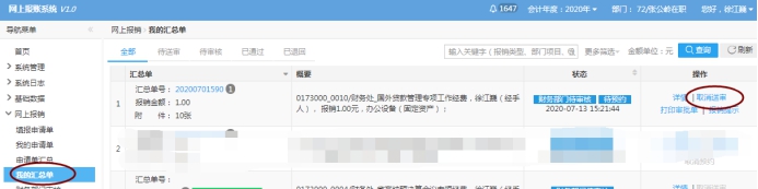 26.报账老师反映,在我的汇总单中删除了一个单号,但是在申请汇总单仍旧出现删除的申请单,导致项目经费中的指标无法退回,这是什么原因,要怎么解决? 36