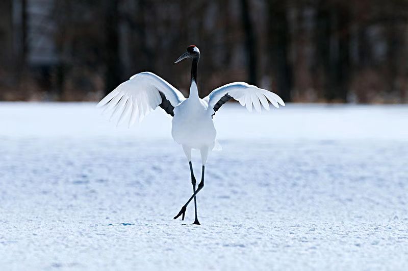 形态:丹顶鹤体长约160cm,翼展240cm,体重约7-10.5kg。全身几乎纯白色,头顶裸露无羽、呈朱红色,额和眼先端具黑羽,眼后方耳羽至枕白色,颊、喉和颈黑色。次级飞羽和三级飞羽黑色,三级飞羽长而弯曲,呈弓状,覆盖于尾上。嘴较长,呈淡绿灰色,尖端黄色。颈、腿也都很长,两翅中间长而弯曲的飞羽,为黑色,虹膜褐色,胫裸露部分和跗蹠及趾灰黑色,爪灰色。