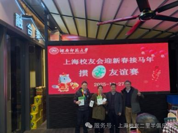 本次“迎新春接马年”掼蛋友谊赛由湖南师大生科院上海校友会发起,联合医学院、化学化工学院等兄弟学院校友会及上海校友总会协同组织。上海校友会和生科院分会支持本次活动经费,生科院89级田代科赞助一批由他本人主编的科普著作《四叶草真的能带来好运吗——植物的奥秘》,资源与环境学院校友何健辉赞助本次活动葡萄园散养土鸡蛋34箱,活动的成功举办,进一步凝聚了在沪校友的向心力,为校友会后续开展更多元化的校友服务与交流活动奠定了坚实基础。未来,湖南师大上海校友会将继续以增进校友情谊、助力校友发展、回馈母校与家乡为己任,搭建更广阔的交流平台,让校友情谊在岁月流转中愈发深厚。